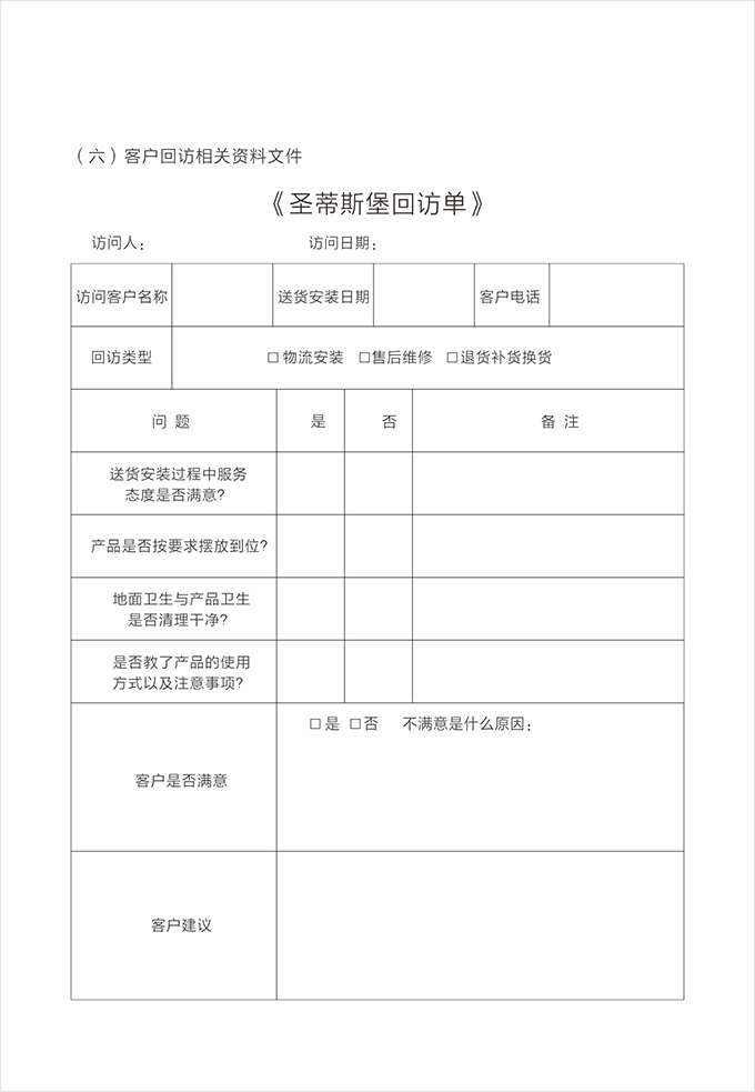 售后人員完成售后,將有客戶簽名的《產品配送單》《配送滿意度調查表》交給店面經理。店面經理根據處理完成結果登記存檔,并對客戶進行回訪,確定送貨安裝服務完成,并了解客戶對公司整個服務過程的滿意情況。